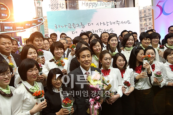 [포토]김정태 하나금융지주 회장, 직원들과 함께 기념촬영