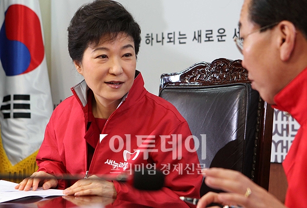 박근혜 새누리당 비상대책위원장과 권영세 사무총장이 27일 오전 여의도 새누리당 당사에서 열린 중앙선거대책위원회의에 참석해 이야기를 나누고 있다.