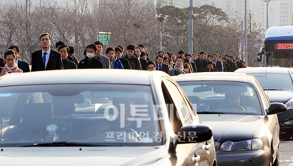 2012서울 핵안보정상회의 이틀째인 27일 오전 코엑스로 진입하는 도로의 통제로 출근길 교통혼잡이 극에 달하고 있다. 코엑스 인근의 직장인들이 도보를 이용해 출근길을 서두르고 있다.