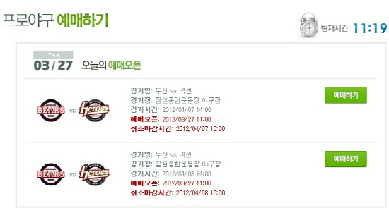 실시간 예매사이트 '티켓링크'는 27일 오전 11시부터 두산과 넥센의 프로야구 개막 2연전 경기 예매를 시작한다고 밝혔다.