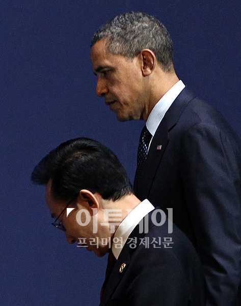 이명박 대통령과 버락 오바마 미국 대통령이 27일 서울 삼성동 코엑스에서 열린 '2012 서울 핵안보정상회의 기념촬영'에 입장하고 있다.