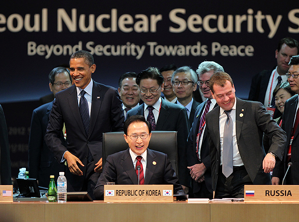 27일 오전 서울 삼성동 코엑스에서 열린 2012 서울 핵안보정상회의에서 이명박 대통령이 버락 오바마 미국대통령, 메드베데프 러시아 대통령과 밝게 웃고 있다.