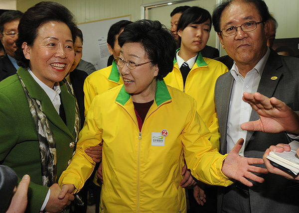 민주통합당 한명숙 대표가 27일 전남 나주를 방문, 지역후보들과 함께 선거운동을 벌이고 있다.