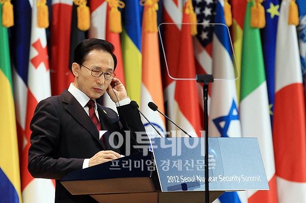 이명박 대통령이 2012서울 핵안보정상회의 폐막일인 27일 오후 서울 코엑스 오디토리움에서 열린 폐막 기자회견에서 취재진의 질문을 받고있다.