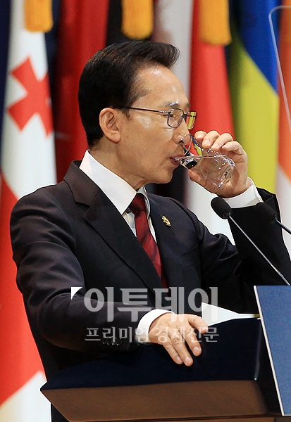 이명박 대통령이 2012서울 핵안보정상회의 폐막일인 27일 오후 서울 코엑스 오디토리움에서 열린 폐막 기자회견중 물을 마시고 있다.