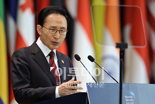 이명박 대통령이 2012서울 핵안보정상회의 폐막일인 27일 오후 서울 코엑스 오디토리움에서 정상회의 폐막 기자회견을 갖고 있다.