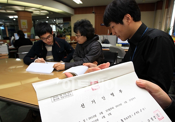 4.11총선을 14일 앞둔 28일 오전 서울 서초4동 주민센터를 찾은 한 주민이 선거인명부를 확인하고 있다. 총선 선거권자는 28일부터 30일까지 3일간 선거인명부를 열람하고 누락이나 오류에 대해 이의신청을 할 수 있다. 열람방법은 해당자치센터의 방문이나 구 인터넷 홈페이지를 통해 가능하다.