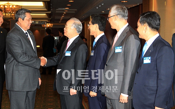 손경식 대한상공회의소 회장이 28일 오전 서울 역삼동 르네상스호텔에서 열린 경제4단체 초청 인도네시아 대통령 조찬간담회에서 수실로 밤방 유도요노 대통령을 맞이하고 있다.