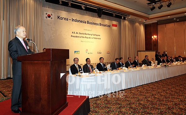 손경식 대한상공회의소 회장이 28일 오전 서울 역삼동 르네상스호텔에서 열린 인도네시아 대통령 초청 경제4단체 조찬간담회에서 인사말을 하고있다.