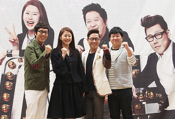 28일 오후 서울 양천구 목동 SBS 사옥에서 열린 '고쇼(GO Show)' 기자간담회에서 MC를 맡은 개그맨 김영철(왼쪽부터), 배우 고현정, 가수 윤종신, 개그맨 정형돈이 포즈를 취하고 있다.