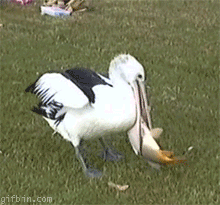 그러나 팰리컨은 물고기가 무거워서인지 먹지 못한다. 목으로 넘어가지 않은 물고기는 팰리컨의 커다란 아래턱 주머니 속으로 들어가버리고 만다. 결국 몇 차례 힘겨운 시도를 하던 팰리컨은 짜증이 난 듯 물고기를 버리고 가 버린다.