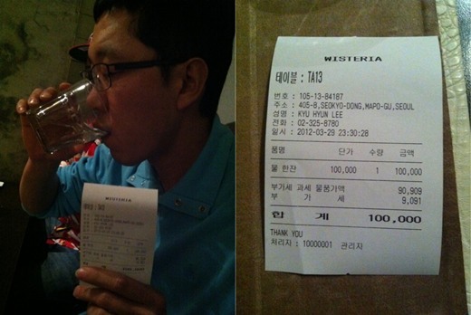 공개된 사진에는 김제동이 한손에는 영수증을 들고 다른 한손에는 물을 마시고 있다. 특히 영수증을 자세히 살펴보면 물 한잔의 금액이 무려 10만원으로 적혀있다.