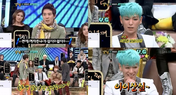 그러자 붐은 “그렇다면 지금은 여자친구 없나?”라고 충긍했고 탑은 “지금은 없다”고 단호하게 답해 붐을 당황케 만들었다.