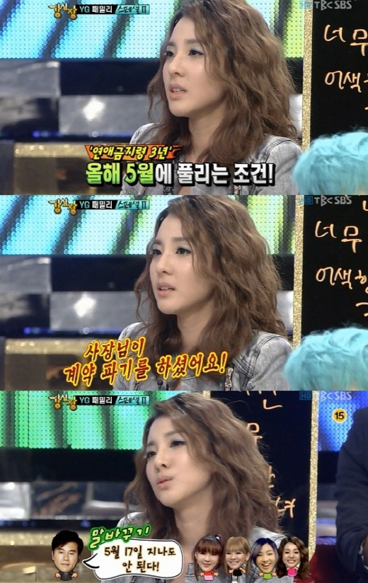지난 3일 방송된 SBS '강심장'에서 산다라박은 "양현석 사장님이 당초 연애금지 3년을 거셨다"라며 "그 기한이 올해 5월17일까지라서 그날만을 기다리고 있었다"고 설명했다.