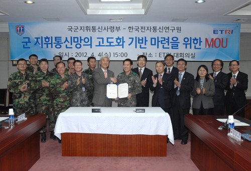 ETRI(한국전자통신연구원)와 국군지휘통신사령부는 4일 오후 대전 ETRI에서 김흥남 ETRI 원장, 박래호 국군지휘통신사령부 사령관 등 관계자 30여 명이 참석한 가운데 ‘IT 기반 군 지휘통신망 고도화를 위한 협력협정(MOU)’을 체결했다고 밝혔다.
