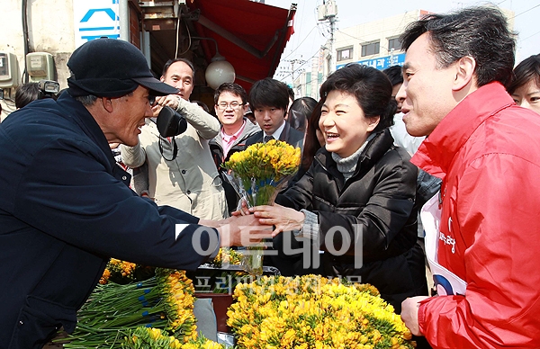 새누리당 박근혜 중앙선대위원장이 4일 오전 의왕시 삼동 도깨비시장을 방문해 상인에게 프리지어를 받으며 환하게 웃고 있다.