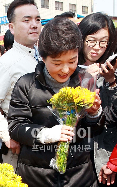 새누리당 박근혜 중앙선대위원장이 4일 오전 의왕시 삼동 도깨비시장을 방문해 상인에게 받은 프리지어의 향기를 맡고 있다.