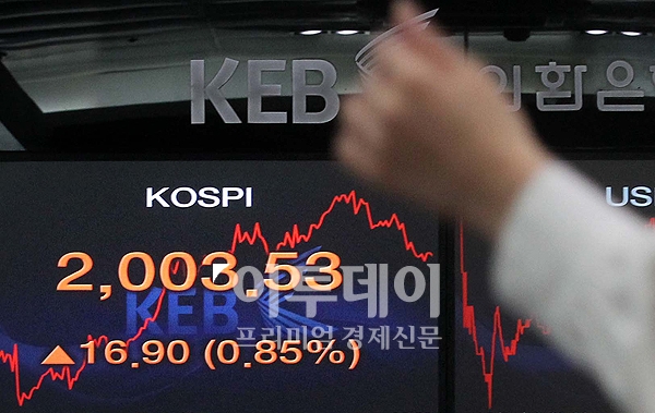 코스피 지수가 13일 오전 미국 뉴욕증시가 호재로 나흘만의 반등으로 출발했다. 개장 전 북한이 장거리로켓을 발사했지만 증시에 미치는 영향은 미미했다. 소공동 외환은행 딜링룸에서 코스피 지수가 2000.30에 거래되고 있다.