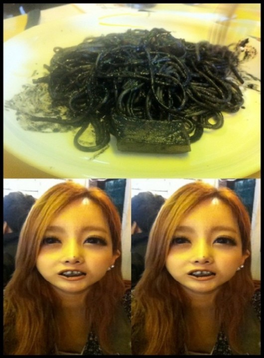 공개된 사진에서 큐리는 먹물 스파게티의 잔재가 낀 치아를 훤히 드러내며 카메라를 응시하고 있어 마치 외계인을 연상케 하고 있다. 이와 함께 먹물 스파게티의 인증샷을 함께 올렸다.