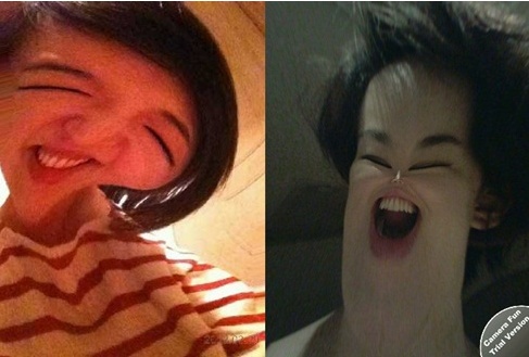 사진 속 가인은 얼굴을 변환시키는 프로그램으로 눈이 턱에 닿을 기세다. 그래도 웃는 모습이 예쁜 이 사진은 봐줄 만 하다.
