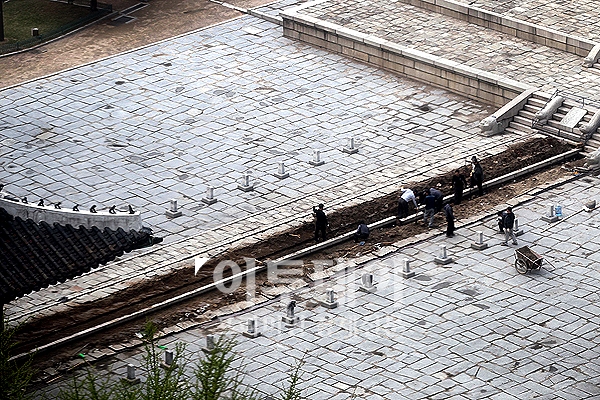 문화재청 직영 보수단 관계자들이 월요일 휴관을 맞아 23일 오후 덕수궁 중화전 앞에 세월이 지나 흐트러진 박석(薄石: 얇고 넓적하게 뜬 돌)들을 어긋나지 않게 드잡이(그대로 옮겨 경계선을 바로잡는 작업) 하고 있다.