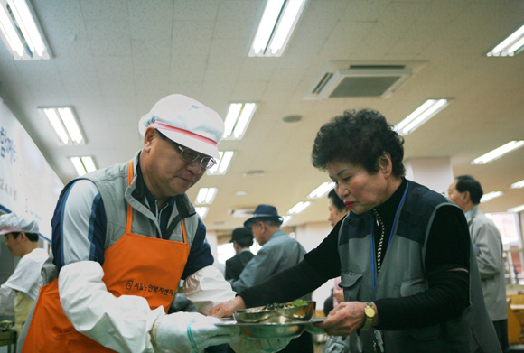 ▲박원식 한국은행 부총재(왼쪽)가 지난 28일 서울 종로구 서울노인복지센터에서 급식 봉사활동을 하고 있다.(한국은행)