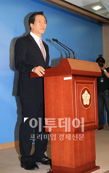 새누리당 정몽준 전 대표가 29일 오전 여의도 국회 정론관에서 기자회견을 갖고 "위대한 국민과 함께 새로운 역사, 새로운 기적, 새로운 희망을 만들겠다" 며 대선 출마를 선언하고 있다.