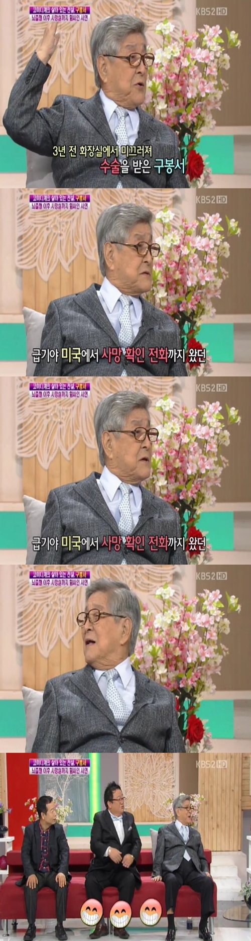 구봉서는 2일 방송된 KBS 2TV '여유만만'에 출연해 "3년 전 화장실에서 미끄러져 뇌를 다쳤다. 그동안 뇌출혈로 고생해 사망설까지 퍼졌다"라고 밝혔다.