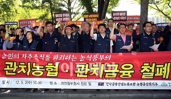 전국금융산업노동조합 농협중앙회지부 노조원들이 2일 오전 과천정부청사 정문 앞에서 농림수산식품부의 농협에 대한 ‘경영개선 이행약정서’체결 철회를 요구하며 구호를 외치고 있다.