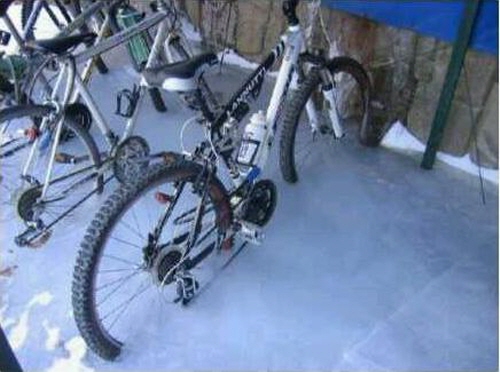 공개된 사진 속 '자연이 선물해준 자물쇠'는 자전거 보관소 바닥이 꽁꽁 얼어 굳이 자물쇠를 자전거에 채우지 않아도 누구도 훔쳐갈 수 없는 상태다.