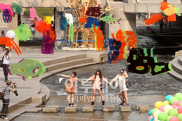 2012 청계천 축제가 한창인 8일 서울 청계광장에서 시민들과 관광객들이 설치미술작품 ‘파란만장’ 에서 기념촬영을 하고 있다. 청계천 축제는 오는 13일까지 계속된다.