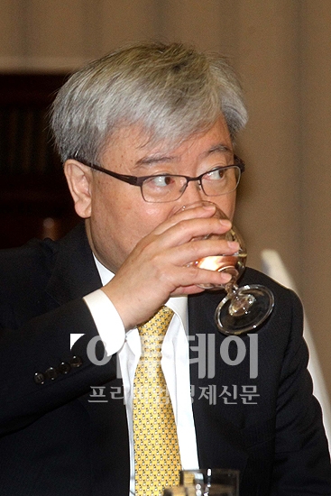 김석동 금융위원장이 9일 오전 서울 중구 명동 은행회관에서 열린 제741회 수요정책포럼에 참석해 강연을 하기 전에 물을 마시고 있다.