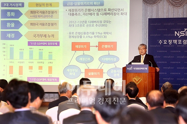 김석동 금융위원장이 9일 오전 서울 중구 명동 은행회관에서 열린 제741회 수요정책포럼에 참석해 새로운 경제 패러다임 하에서의 향후 금융정책 방향에 대해 강연을 하고 있다.