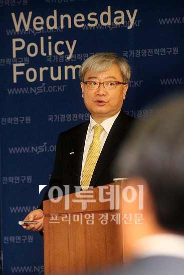 김석동 금융위원장이 9일 오전 서울 중구 명동 은행회관에서 열린 제741회 수요정책포럼에 참석해 새로운 경제 패러다임 하에서의 향후 금융정책 방향에 대해 강연을 하고 있다.