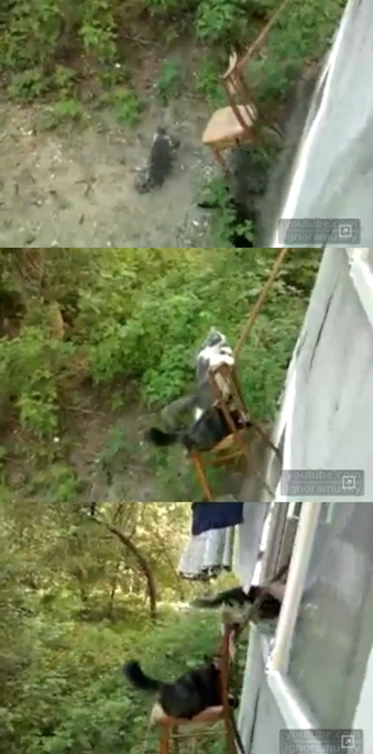 공개된 영상에서는 공터에서 놀고 있던 고양이 두 마리가 밧줄에 매달린 의자에 올라탄다. 고양이는 자연스럽게 의자에 올라 등받이를 붙잡고 주인은 이 밧줄을 끌어당겨 2층으로 보이는 창문 안으로 고양이가 들어오게 하는 데에 성공한다.