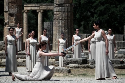 그리스 아테네의 헤라 신전에서 9일(현지시간) ‘2012 런던 올림픽’성화 채화식을 하루 앞두고 리허설을 하고 있다. 성화는 다음날 채화식 이후 오는 7월27일 런던올림픽 개막식에 도착하게 된다. 아테네/AP연합뉴스