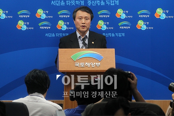 권도엽 국토해양부장관이 10일 오전 정부과천청사 브리핑실에서 ‘주택거래 정상화 및 서민·중산층 주거안정 지원방안’에 대해 발표하고 있다. 대책 주요내용에는 투기지역·주택거래신고지역 해제,분양권 전매제한기간 완화,민영주택 재당첨 제한 폐지 등 시장과열기에 도입된 규제 정상화가 포함돼있다.