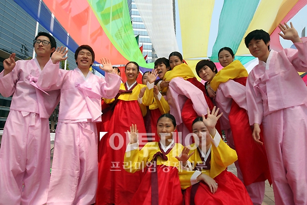 2012 성년의 날 기념행사가 10일 오전 삼성동 코엑스 앞에서 열렸다. 행사에 참석한 학생들이 친구들과 성년이 된 것을 기뻐하며 축하하고 있다.