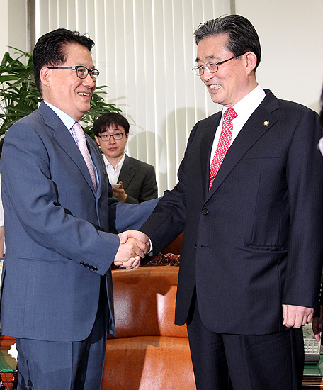 민주통합당 박지원 원내대표가 10일 국회 대표실을 방문한 새누리당 이한구 원내대표와 인사하고 있다.