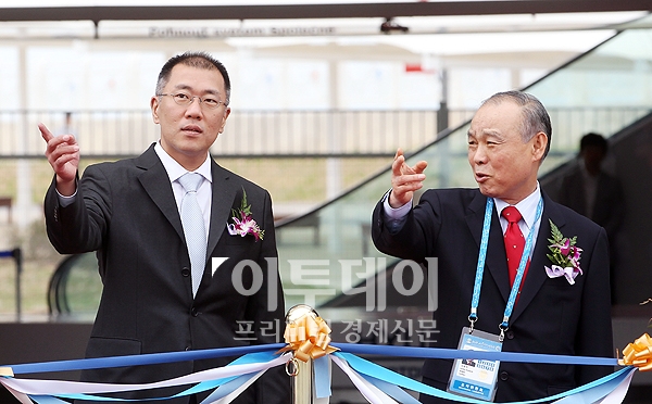 정의선 현대자동차 부회장이 11일 오후 전남 여수시 덕충동 2012여수엑스포 현대차 홍보관 준공식에 참석해 강동석 조직위원장과 대화를 나누고 있다.