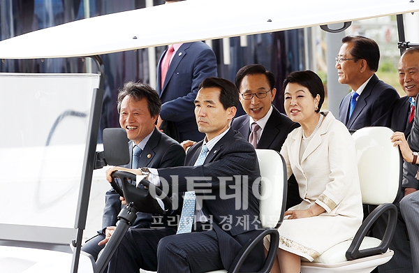 이명박 대통령과 김윤옥 여사가 2012여수엑스포 개막일인 11일 오후 전남 여수시 덕충동 엑스포 지구내 스카이타워를 둘러본 후 권도엽 국토해양부장관과 함께 카트를 타고 이동하고 있다.