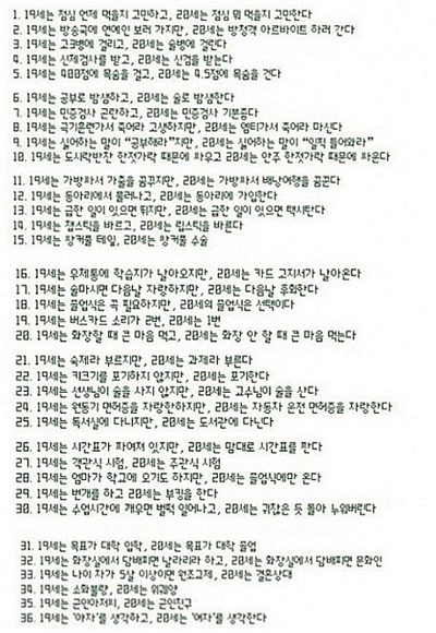 이 게시물에는 총 36가지 항목으로 19세와 20세의 차이점이 나열돼 있다. 19세는 버스카드 찍을 때 소리가 두 번 나고 20세는 한 번 소리 나는 것부터 다르다, 19세는 400점에 목숨을 걸고, 20세는 4.5점에 목숨을 건다, 19세는 밤새 공부를 하지만, 20세는 밤새 술을 마신다, 19세에게 군인은 아저씨고 20세에게 군인은 친구 등으로 고작 1살 차이지만 매우 다른 상황을 대조적으로 보여줘 네티즌들에 공감과 웃음을 주고 있다.