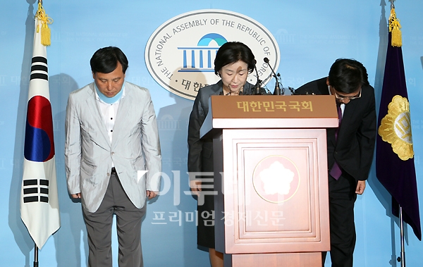 조준호, 심상정, 유시민 통합진보당 공동대표가 14일 오전 국회 정론관에서 대표직 사퇴의사를 밝히며 고개 숙여 사과하고 있다.
