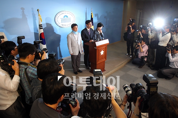 조준호, 유시민, 심상정 통합진보당 공동대표가 14일 오전 국회 정론관에서 대표직 사퇴의사를 밝히고 있다.