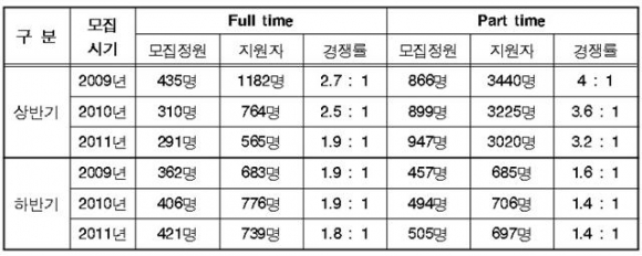 올해 상반기에는 11개 대학에서 총 1198명의 한국형 MBA 신입생을 모집한 결과 3255명이 지원해 평균 2.72대 1의 경쟁률을 보였다. 2011년 상반기 경쟁률이 2.9대 1이었던 것과 비교해 다소 낮아진 수치다. 주간 풀타임 과정 가운데는 성균관대가 가장 높은 경쟁률을 보였고 야간·주말 과정은 고려대가 가장 높았다.