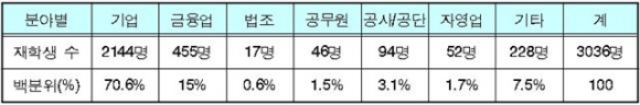 졸업생의 취업률은 78.6%로 지난해 하반기에 취업률 64.5%보다 상승했다. 올 상반기 졸업생은 총 338명이며 이 중 외국인 졸업자 67명을 제외한 271명 중 213명이 취업했다. 기업이 71.4%, 금융업 19.7%로 나타났다.