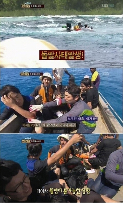 이날 방송에서 멤버들을 뒤따라가던 제작진의 배는 갑자기 거세진 파도로 배가 뒤집히는 사고를 당했고, 이같은 돌발사태에 김병만, 리키김, 추성훈은 제작진을 구하기 위해 바다로 뛰어들었다.