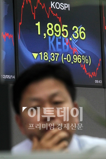 코스피 지수가 유럽리스크와 외국인ㆍ기관 동반 매도로 4개월만에 1900선이 붕괴됐다. 15일 오전 소공동 외환은행 딜링룸에서 코스피 지수가 1895.36에 거래되고 있다.