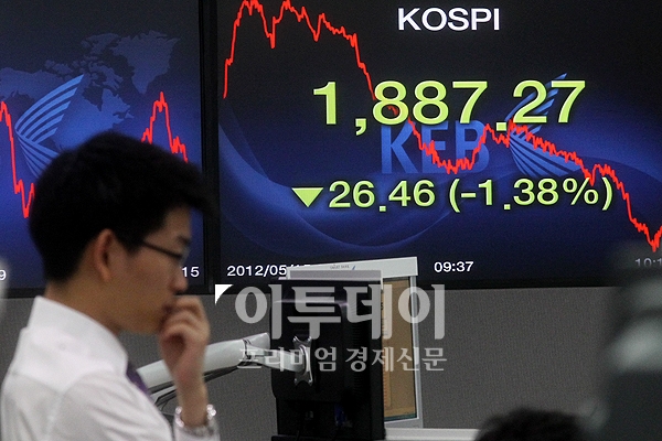 코스피 지수가 유럽리스크와 외국인ㆍ기관 동반 매도로 4개월만에 1900선이 붕괴됐다. 15일 오전 소공동 외환은행 딜링룸에서 코스피 지수가 1887.27에 거래되고 있다.