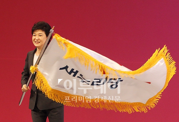 박근혜 새누리당 비대위원장이 15일 오후 경기도 일산 킨텍스에서 열린 새누리당 제1차 전당대회에서 당직자로 부터 건네받은 당기를 흔들고 있다.
